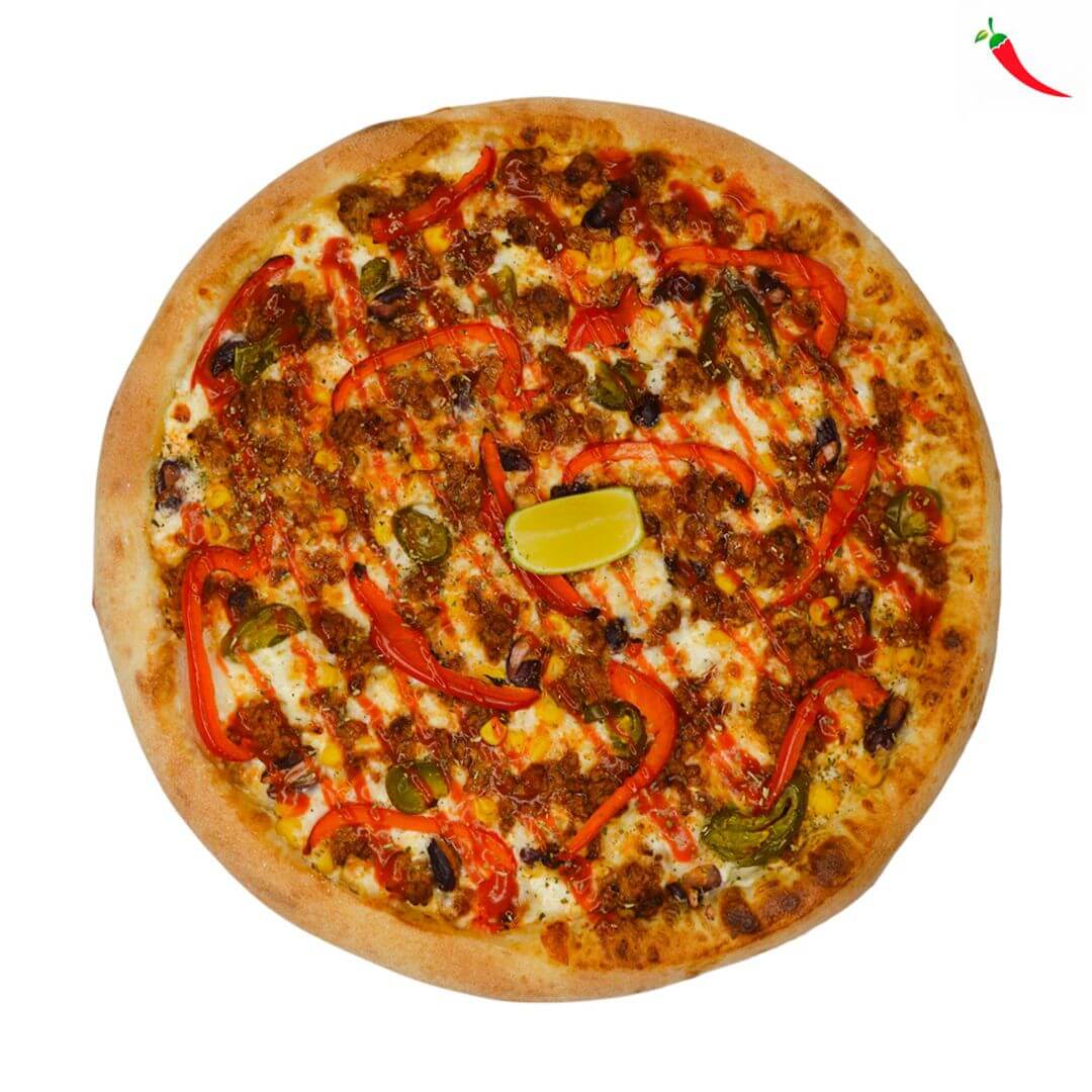Состав продукции: Тесто для пиццы, сливки, сыр моцарелла, мясной соус Болоньезе — фарш свинина-говядина тушеный в соусе пилати со специями и чесноком, перец болгарский, фасоль консервированная, кукуруза консервированная, лайм, перец халапеньо, соус Шрирача, приправа орегано.