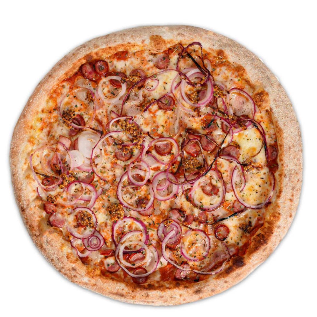 Состав продукции: Тесто для пиццы, соус пилати, колбаски охотничьи, грудинка, сыр моцарелла, лук красный, масло.
