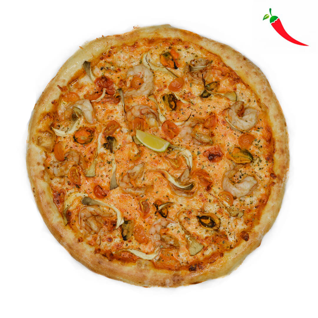 Состав продукции: Тесто для пиццы, соус Том Ям, сыр моцарелла, креветки, мидии, грибы вешенки, помидоры черри, лайм, приправа орегано.